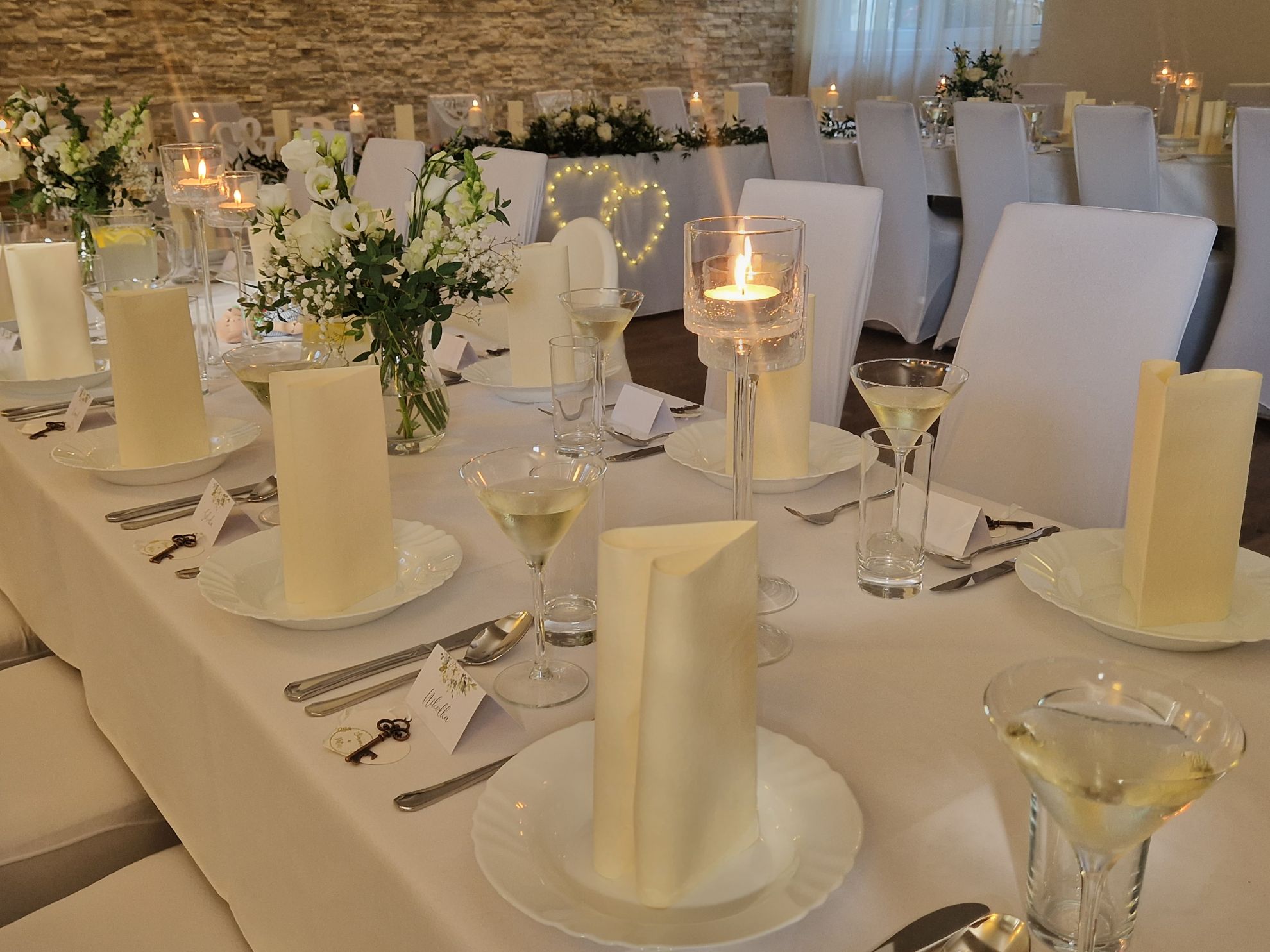slavnostné nastretie stolov, kvety, štóly, servítky, svietniky, uvítaciu tabulu, nasvietenie priestoru, hudbu, ozvučenie...